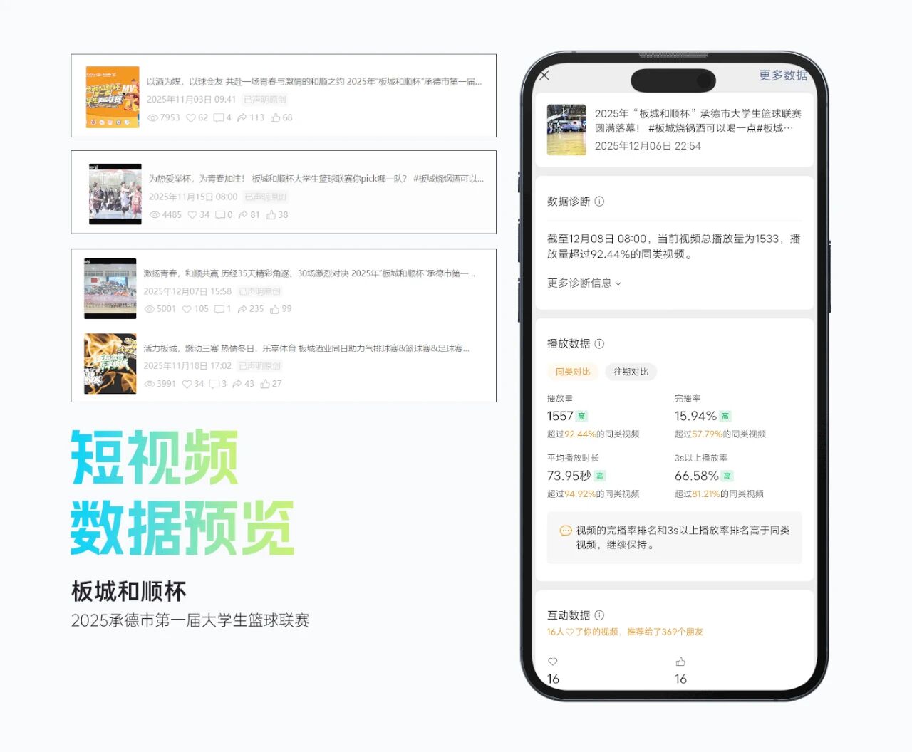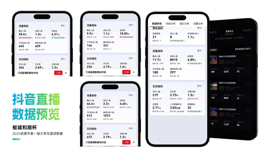 整体活动影响力显著,赛事抖音曝光超214万,累计观看直播人数超15万人,现场累计吸引观众逾2万人次,承德市篮球协会微信公众号相关阅读量超2万人次,板城酒业视频号平台相关播放量超2.5万人次。