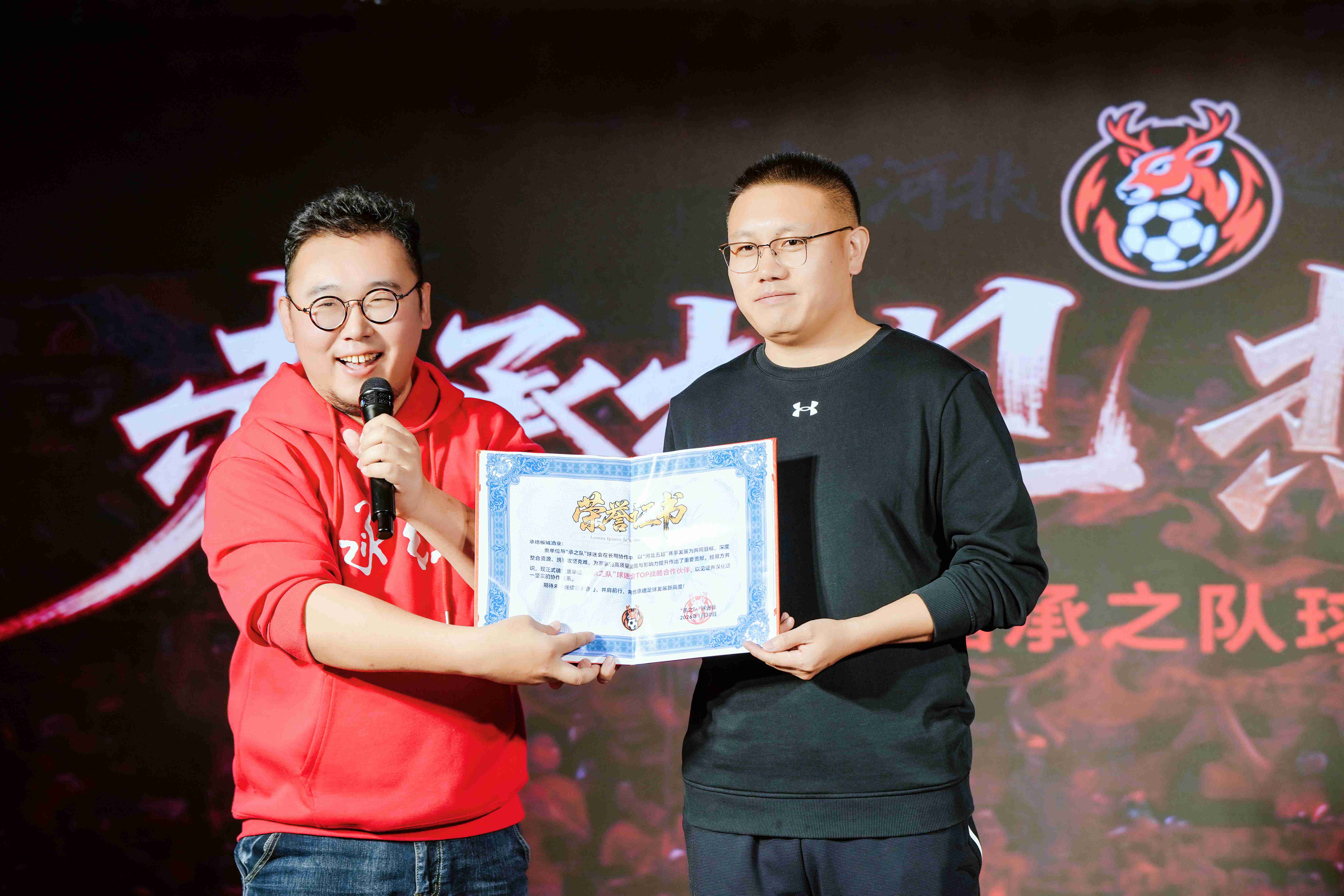 致辞结束后,现场举行了授牌仪式,承德新鲜事儿创始人、“承之队”球迷负责人朱孟博向板城酒业授予了“TOP战略合作伙伴”荣誉证书,以表彰其长期以来的鼎力支持与深度协作,共同推动承德足球事业的发展。这一荣誉,见证着双方深厚的情谊与坚实的伙伴关系。